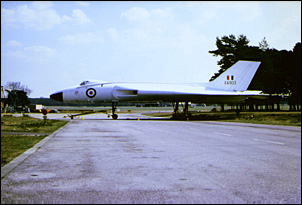 Completed in June 1957, XA903 was retained by Avro's factory airfield at Woodford instead of being delivered straight away to the RAF squadrons then forming at Waddington, Finningley and Scampton. It was destined for different and important roles even then. When eventually all this work was completed, the Vulcan was sold to Bristol Siddeley Engines - later taken over by Rolls Royce - and became one of the major tools in the Concorde programme. At the end of its career, no one wanted this lone B1 as museums were preparing for the arrival of Vulcan B2s in a few years time. XA903 was offered to Farnborough for fire training, so ending its career. XA903 was parked on the edge of the disposal compound for some time, being slowly robbed of various items for research. After a while the nose, pressure cabin and forward fuselage were taken away and all that remained was the rest of the airframe sitting down on its rear end with the remainder of the forward fuselage pointing up into the sky.